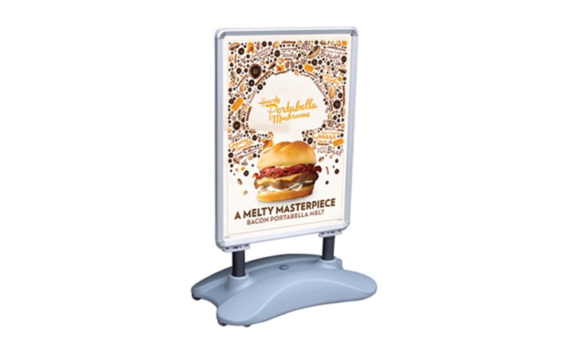 Specifically designed for outdoor use, the Outdoor Sidewalk Sign can withstand most weather conditions. With spring shocks that allow the sign to sway back and forth during high winds, you can be sure this sign will not topple over. The base can be filled with sand or water adding even more stability. With a huge display area, you can easily attract many people with this outdoor sidewalk sign. All of the borders snap open and allowing you to easily change your graphics.