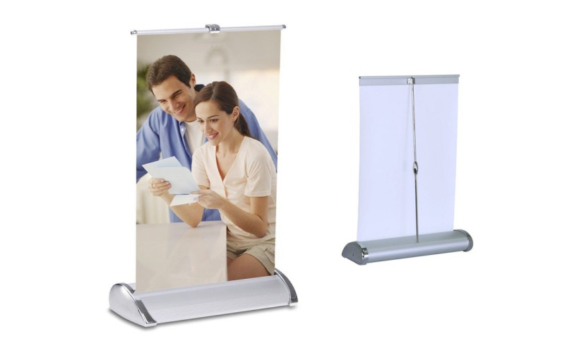 The TableRollMini is a tabletop retractable banner stand that can hold a small sign in a minimum amount of table space and is perfect for that focused message.
